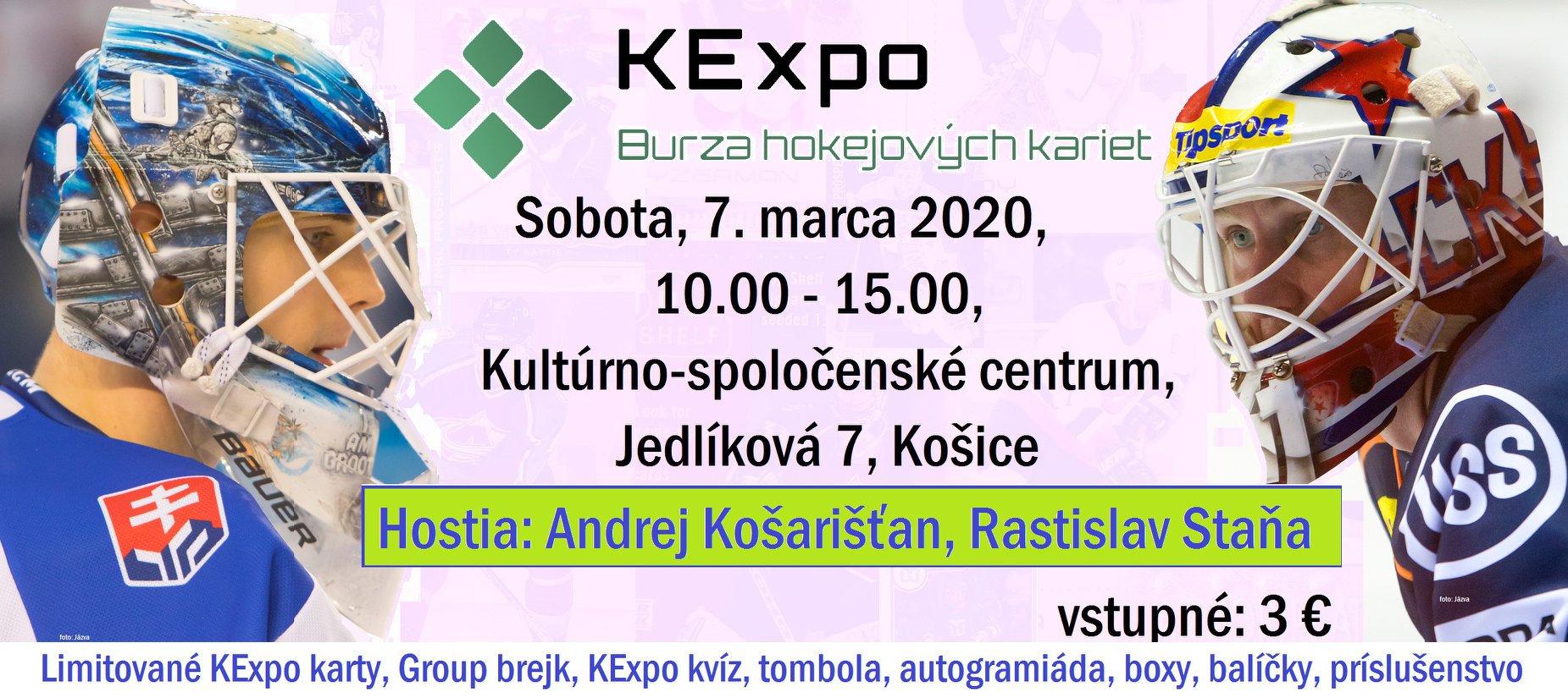 Prvá burza v roku 2020 odštartuje tretí ročník pravidelných stretnutí zberateľov hokejových kariet v Košiciach. 🙂 Tešiť sa môžete na: Limitované KExpo karty brankára Andreja Košarišťana, ktorý prisľúbil účasť na burze a takisto aj majstra sveta z roku 2002 Rastislava Staňu. Premiérový vedomostný KExpo kvíz Group brejk, autogramiádu, balíčky, boxy, príslušenstvo, atď.. 😉
