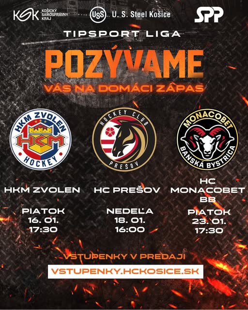 spustili sme predaj vstupeniek na zápas Tipsport ligy, proti Zvolenu (16.01. o 17:30), Prešovu (18.01. o 16:00) a Banskej Bystrici (23.01. o 17:30) .