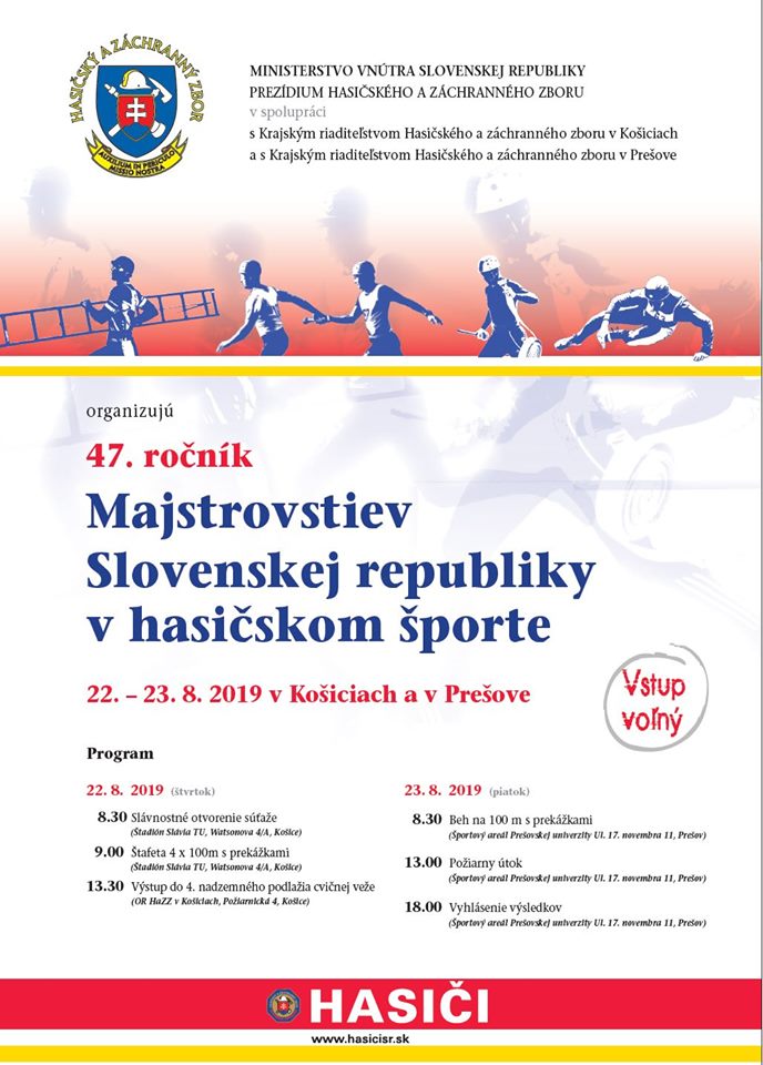 Prezídium Hasičského a záchranného zboru, Krajské riaditeľstvo Hasičského a záchranného zboru v Košiciach a Krajské riaditeľstvo Hasičského a záchranného zboru v Prešove Vás srdečne pozývajú na 47. ročník Majstrovstiev Slovenskej republiky v hasičskom športe, ktoré sa uskutočnia v dňoch 22. – 23. augusta 2019 v Košiciach a v Prešove.