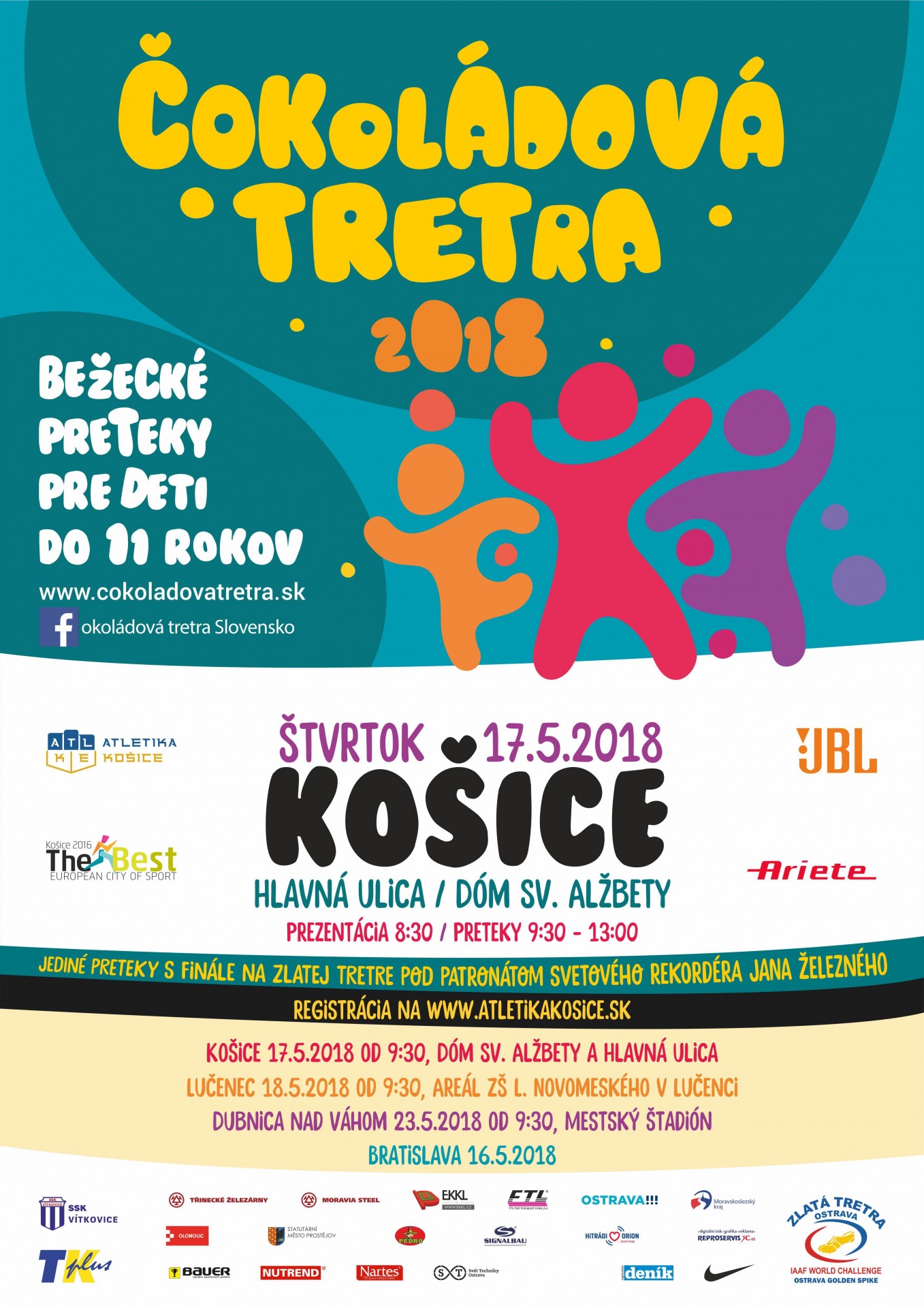 Janko, Danka a Janka si prejdú s deťmi bežeckú abecedu s priestorom na otázky. V rámci slovenského finále ČT 2018 taktiež prebehne štafetová súťaž krajov.  Táto súťaž sa uskutoční na Hlavnom námestí pred Urbanovou vežou, kde bude na dlažbu pripevnený umelý povrch Mondo o dĺžke 50yardov pre 4 dráhy. Po skončení štafiet, bude táto trať, prístupná všetkým záujemcom, ktorí si budú môcť zabehnúť svoje neoficiálne preteky či neoficiálnu štafetu. Po skončení pretekov Čokoládová Tretra cca od 14:30 prebehne aj autogramiáda našich ambasádorov Janka Volka a sestier Veľdákových, dlhoročných reprezentantiek SR.