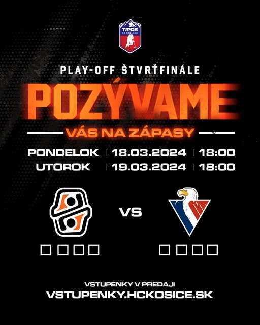 predaj vstupeniek na štvrťfinálové zápasy Tipos Extraligy proti HC Slovan Bratislava (v pondelok 18. 3. o 18:00 a utorok 19. 3. o 18:00) bol spustený.