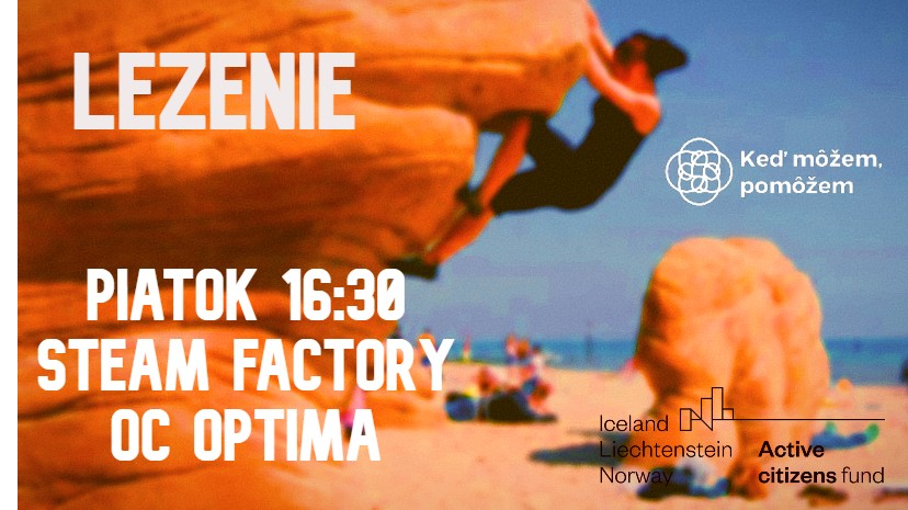 Príď si s nami vyskúšať, aké je to vyšplhať až na vrchol, zdolať prekážky a dotknúť sa hviezd. Prísť si s nami zaliezť v piatok do Steam Factory v Optime a pod skúsenými lezeckými borcami sa naučiť niečo nové. Čo potrebuješ - zober si čo najtesnejšie topánky a strach z výšok nechaj doma. Prídu mladí z Dorky a Luníka a možno ešte niekto.