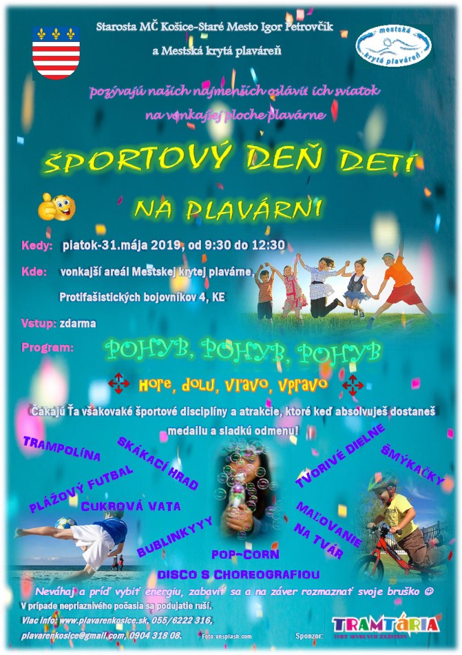 Čo robíš v piatok doobedu? Nič? Tak zbaľ mamku, ocka, brata, sestru a príď šantiť do mesta! Mestská krytá plaváreň na svojej vonkajšej ploche (vchádza sa spred „mekáča“) pre Teba o Tvojich blízkych pripravila program plný pohybu a zábavy... a aj nejakú sladkú odmenu (neboj, mama dovolí). Veď pozri na plagát čo všetko u nás zažiješ. Jááj, ty nevieš ešte poriadne čítať, to si len uchmatol mame mobil kým varí? Nič to, pozri na obrázky a mobil pekne vráť mamke. Že jej odkazujeme, nech si na piatkove dopoludnie nerobí program, u nás rozloží deku, vyloží nožičky zatiaľ čo ty budeš behať od skákacieho hradu k futbalu, od tvorivých dieľničiek ku šmýkačkám a ešte všade inde. Príď, tešíme sa na Teba!