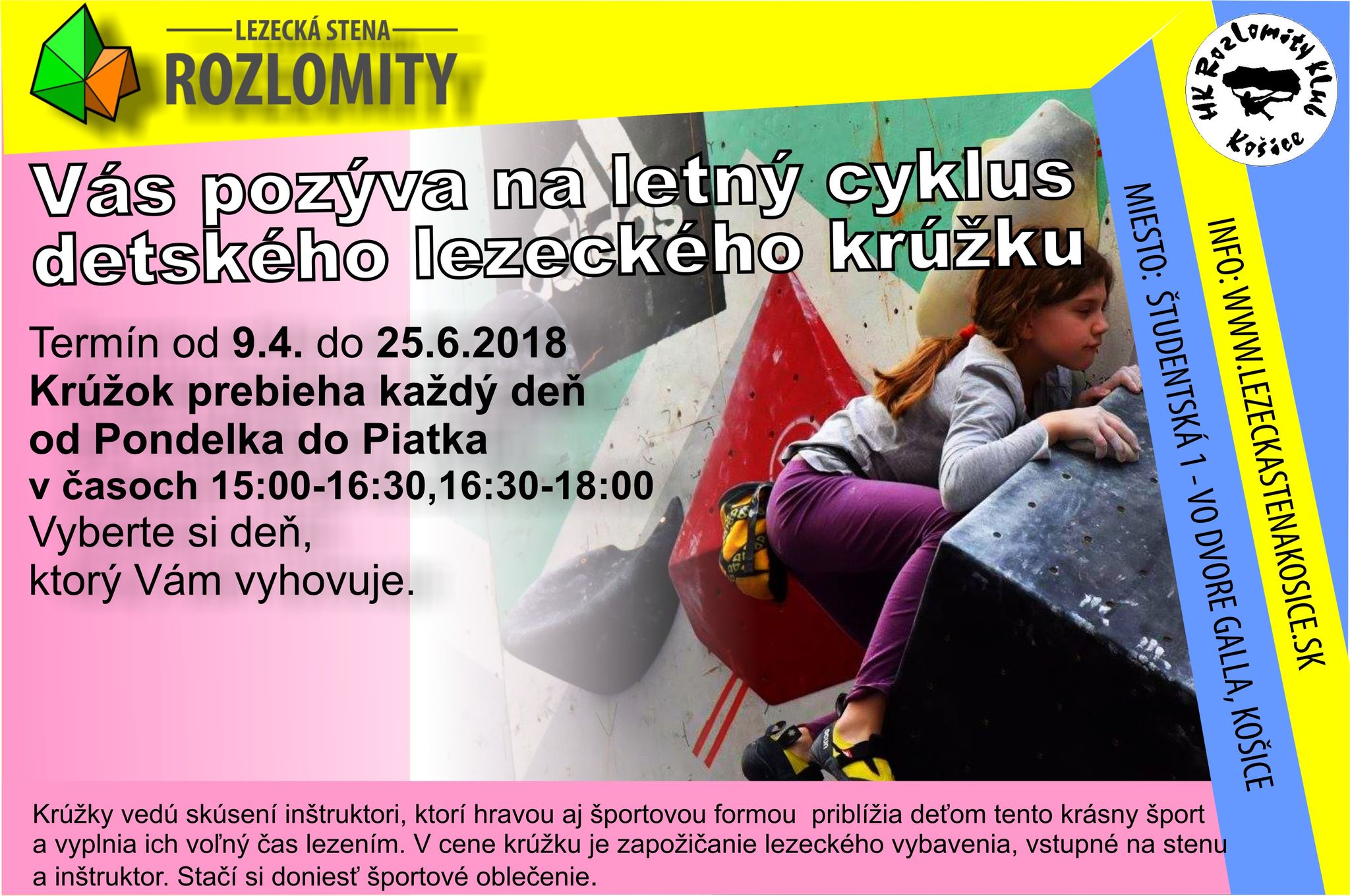 Krúžky a tréningy detí vedú skúsení inštruktori. Ďalšie informácie radi poskytneme priamo na lezeckej stene alebo na číslo 0949 429 260 alebo 0903 230 175.