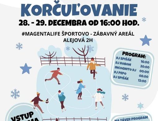 December a koniec roka už tradične prinášajú do nášho #MAGENTALIFE Športovo-zábavného areálu na Alejovej ulici 2H ikonické NONSTOP KORČUĽOVANIE ⛸❄️. V spolupráci s ďalšími mestskými časťami sme si pre Vás pripravili túto zimnú udalosť znovu. Príďte si zašportovať, pridajte sa k nám a nesúťažne si zakorčuľujte na jedinečnej ľadovej ploche s unikátnym zastrešením. Vstup na podujatie je voľný a na konci na Vás čaká mimoriadne prekvapenie! 💙